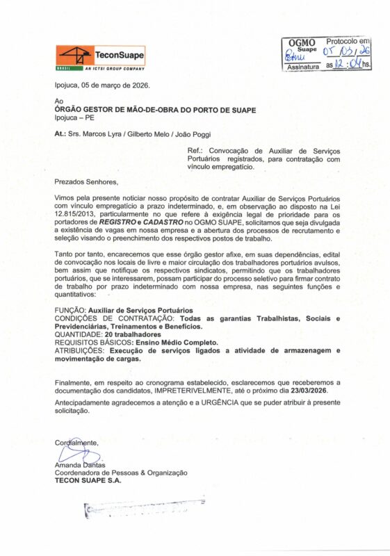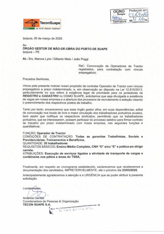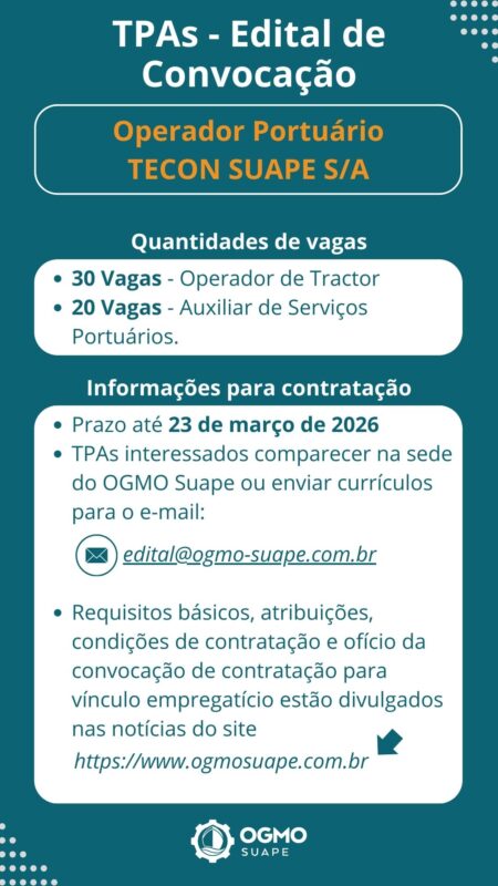 O TECON Suape S/A está com 50 vagas abertas para contratação de trabalhadores portuários avulsos. Confira as oportunidades disponíveis: