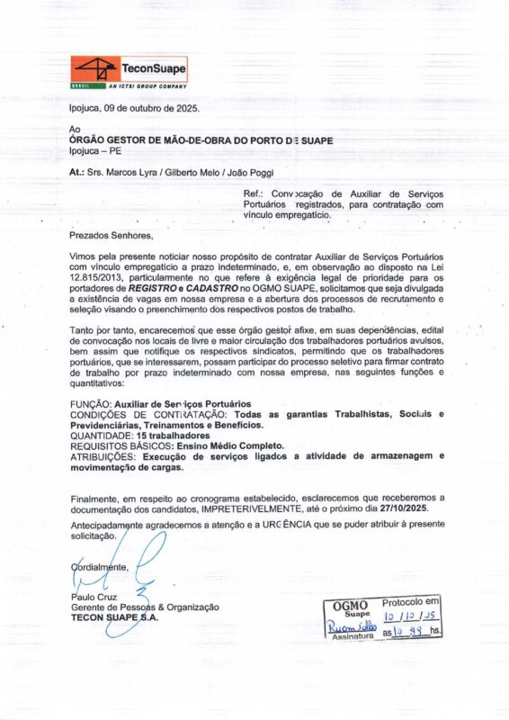 Todas as informações sobre o processo seletivo incluindo condições de contratação, requisitos básicos, atribuições das funções, benefícios e o cronograma para entrega de documentos estão disponíveis no link acima e no Edital de Convocação de Trabalhadores Portuários Avulsos.
