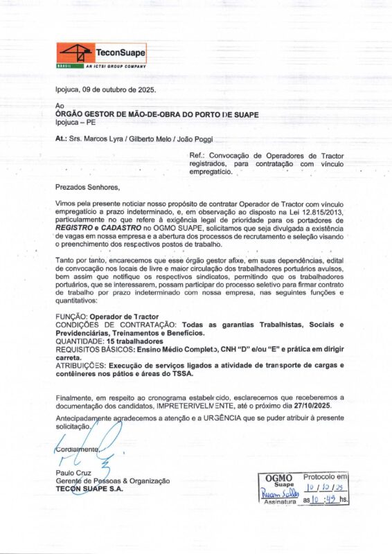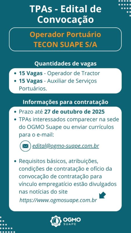 O TECON Suape S/A está com 30 vagas abertas para contratação de trabalhadores portuários avulsos. Confira as oportunidades disponíveis: