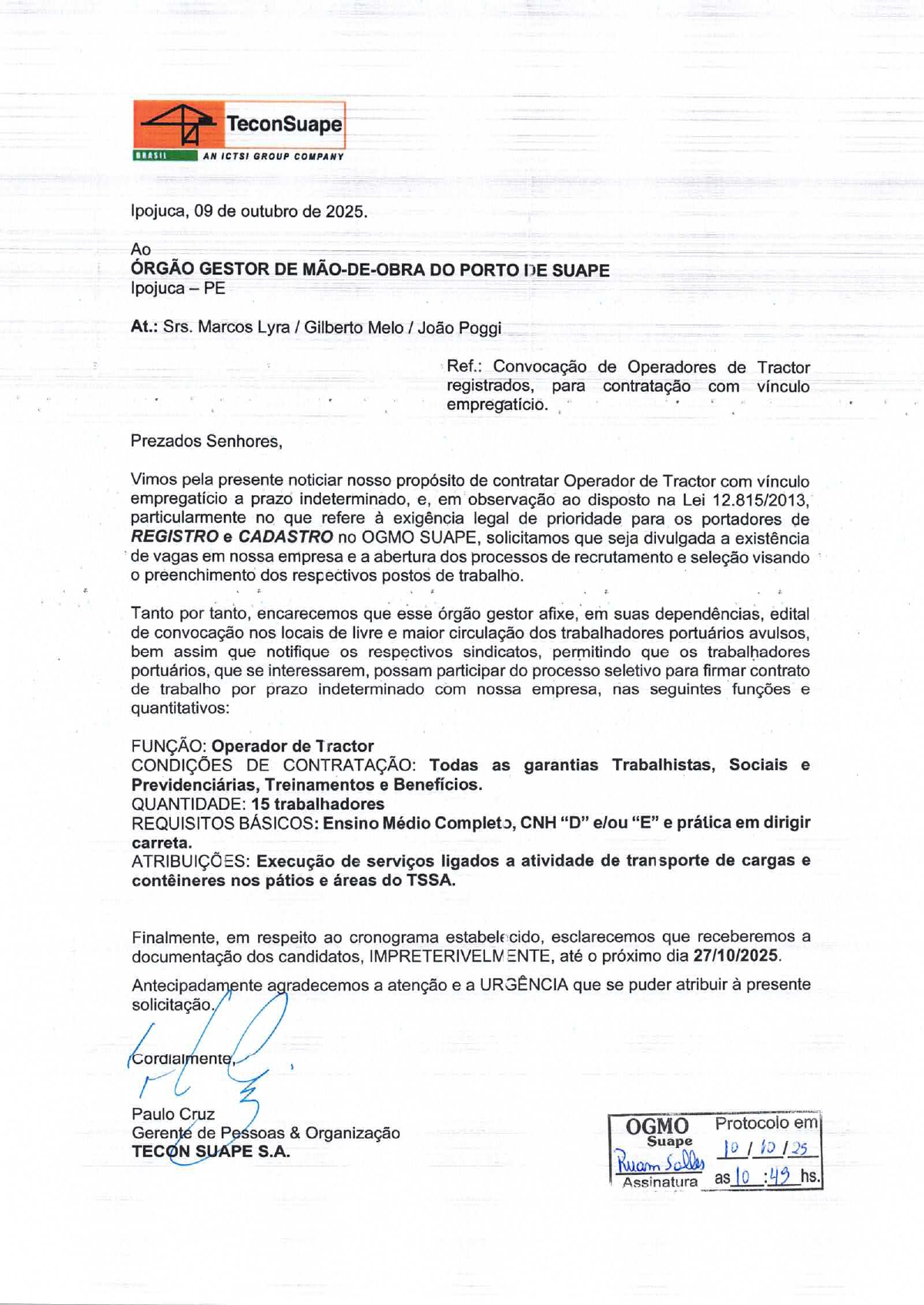 Todas as informações sobre o processo seletivo incluindo condições de contratação, requisitos básicos, atribuições das funções, benefícios e o cronograma para entrega de documentos estão disponíveis no link acima e no Edital de Convocação de Trabalhadores Portuários Avulsos.